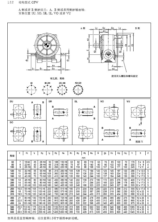 CFW蝸輪蝸桿減速機廣泛應用于礦山、建筑、石油、冶金等重型行業,其傳動扭矩大、傳動效率高、使用壽命長等特點在國內得到大力推廣,CFW減速機為環面蝸桿傳動系列,制造工藝相對復雜所以價格較高。 CFW蝸桿減速機采用輸出軸并配有輸出法蘭連接,隨意安裝。用戶選擇時可根據實際使用需要選擇合適的安裝方式,具體安裝形式及安裝尺寸如下圖所示