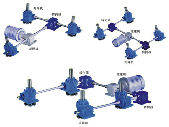 等部件將絲桿升降機與電機、減速機組合起來形成同時升降、同方向旋轉的工作平臺。絲桿升降機聯動平臺負載大、傳動效率高、定位精度高,使用安裝方便。蝸輪蝸桿傳動具有自鎖功能,加強了工作平臺的安全平穩運行。