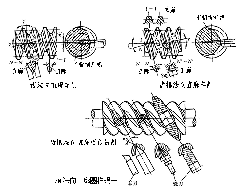 法面直廓圓柱蝸桿蝸桿齒廓在法向截面中為直線,在軸面中微呈凹形曲線,在端截面中齒廓為長幅漸開線。齒形由直線刃成形刀具切削生成,刀具在軸面中與切入方向說成角度等于分度圓柱導程角,成齒線與分度圓柱上蝸桿螺線切線所成角度為齒形角。