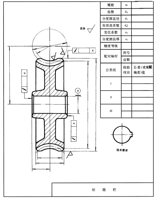 蝸桿、蝸輪圖樣的繪制應(yīng)符合GB4459.2的規(guī)定。圖樣中的參數(shù)表一般放置于圖面的右上方,參數(shù)表中列出的數(shù)據(jù)項目可根據(jù)需要增減,檢驗項目則按使用要求和用戶意見根據(jù)GB10089和有關(guān)標準的規(guī)定確定。圖樣的技術(shù)要求一般放置于圖面的右下方。